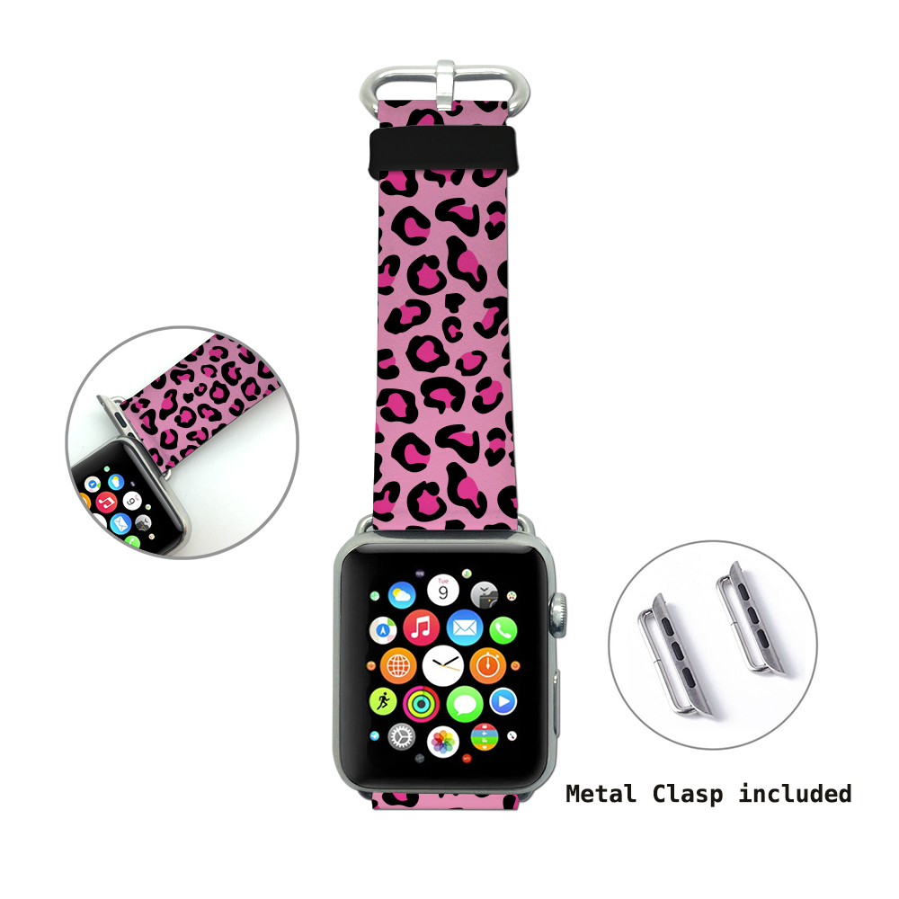 Apple Watch Band, Genuine Leather Strap Wrist Band Replacement with Adapter Metal Clasp for Apple Watch 38mm 42mm All models (Pink Leopard WB07)
