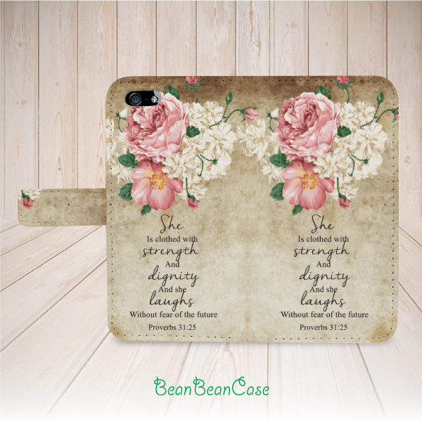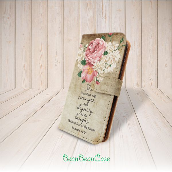 vintage flower quote flip pu leather cover case for iPhone low7/7 Plus/6s/6/5/5s/5c, moto X moto X2, galaxy S5 S6 edge Note 4 5, Proverbs 31:25 (K33)