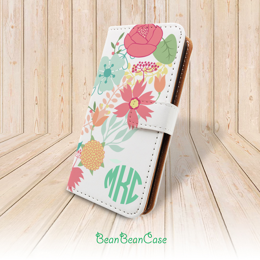 Flower wallet flip cover, monogram custom personalized case for iPhone X/7/6s/6/5/5s/5c, for moto X moto X2, samsung galaxy S5 S6 edge Note 5 4 (A57)