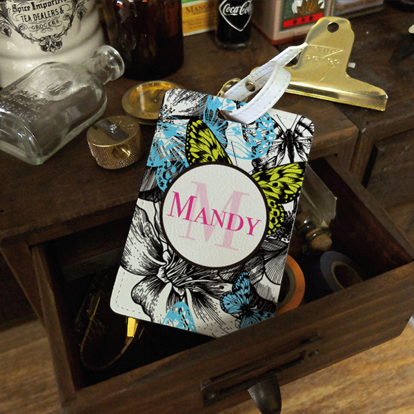 Roses and Flying Butterflies Personalised PU Leather Luggage Tag, Travel Tag, Bag Tag, custom name monogram initial (N-030)